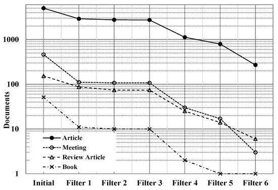 - Filter 4: Keywords at a general level should be contained within the documents (see Table 5), which helps perform filtering that leads to a general orientation toward the subject of studs, obtaining 615 documents for Scopus and 1140 documents for WOS.
