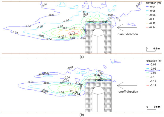 The scour pit shapes caused by different runoff and tidal current intensities are different. The test results show that scour pits occur at the dike head and downstream side under various conditions. Runoff conditions are more obvious than runoff and tidal current conditions. Under the condition of maximum tidal current (Condition 3), obvious scouring also occurred at the upstream side of the dike. This is related to the hydrodynamic effect under different runoff and tidal current conditions. Although the maximum ebb flow velocity under each working condition is 2.5 m/s, it is 2.5 m/s in the whole period under a single runoff condition, while under runoff and tidal current conditions, the maximum ebb flow velocity reaches 2.5 m/s only at the moment, and the duration of hydrodynamic action is significantly different (Figure 4).