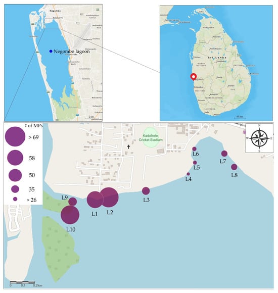 Maps showing the location of the Negombo lagoon and the spatial occurrence of microplastic abundance in shrimps in selected sampling sites. (The size of the circles indicates the number of identified MPs in shrimp tissues).