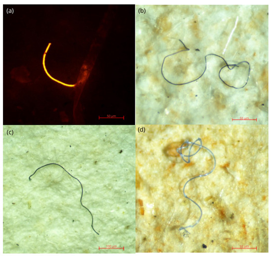 Microplastics recovered from the gastrointestinal tract and gills of P. monodon and P. indicus, imaged under (a) blue light with Nile red fluorescence; and (b–d) white light.