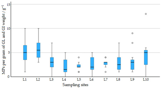 Since the weight of GL + GI weight and body weights were similar between both two species (according to the t-test performed (α = 0.05), for body weights; p = 0.09, for GI + GL weight; p = 0.08), it was possible to carry out a correlation analysis. According to the Spearman correlations, there was a positive correlation observed between the GL + GI weight and MP content (rs (118) = 0.249, p < 0.01), but there was no significant positive/negative correlation observed between body weight and MP content. (rs (118) = −0.048, p < 0.01) A heavier gut suggests more food has been consumed. It therefore makes sense that more feeding leads to more exposure to MPs. A lack of correlation with body weight might suggest body condition is not affected by MP ingestion—or that MPs are not retained long enough to cause an impact.