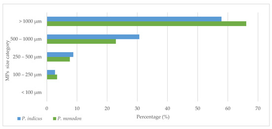 In this study, identified MPs were categorized into five groups, 10–100 μm, 100–250 μm, 250–500 μm, 500–1000 μm, and >1000 μm (Figure 4). Out of the five groups, the size of most of the MPs identified from both shrimp species was under the category of >1000 μm. The sizes recorded in the present study are in line with those of previous observations. In the Bay of Bengal, Bangladesh, P. monodon was found to have mostly ingested MPs between 1 mm and 5 mm [15]. In the present study, P. monodon contained 78 (66%) MPs larger than 1000 μm, with 27 (23%) between 500 and 1000 µm, 9 (8%) between 250 and 500 µm, and 4 (4%) MPs in the size range of 100–250 µm. In contrast, P. indicus shrimp had 172 (58%), 91 (31%), 26 (9%), and 8 (3%) MPs under the size categories of >1000 μm, 500–1000 μm, 250–500 μm, and 100–250 μm, respectively. It is important to note that no MPs were identified with a size between 10 μm and 100 μm. This may be caused by the rapid elimination of those very minute MPs from the gills and guts with the flow of water and ingested foods, respectively. Some long fibers were observed in entangled form, suggesting that those fibers remained for a significant time inside the guts or gills of the animal, mainly due to their longer size. According to a previous study, the average level of microplastics in Negombo lagoon’s surface waters varied from 0.86 to 4.29 items m−3, with a mean level of 2.46 ± 1.13 items m−3. In surface waters, fragments (40.0%), and 2500–1000 μm (41.0%) were the most observed MP types and sizes [5]. Similar observations were reported based on a study in Victoria Australia (Table 2). Accordingly, the mean diameter of MPs in water was found to be in the range of 0.036 to 4668 μm (mean = 942 ± 835 μm), and that in shrimp was 190 to 4214 μm (mean = 764 ± 575 μm) [22]. Further, according to, the Chi-square test performed in this study, the MP size proportion distribution was not significantly affected by the species investigated (χ2 = 2.997; df = 3; p = 0.392).