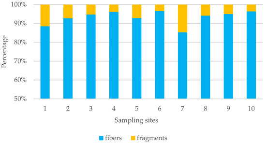 In this study, two main types of MPs were identified, fibers and fragments, but no MPs with the shape of films or spheres were identified. The predominant form of MPs was fiber (93.0%), followed by fragments (6.99%) (Figure 6). No nurdle particles were able to be identified during the study. The shrimps’ high fiber content suggests that the MP contamination of the shrimps was not greatly impacted by the nurdle discharge.