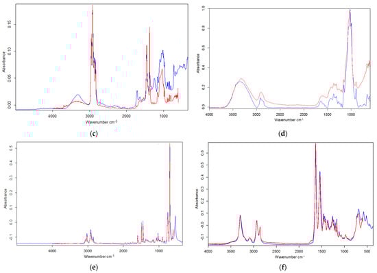 FTIR spectra of different microplastics obtained from the shrimps from the Negombo lagoon (Red—Reference spectrum, Blue—Sample spectrum): (a) rayon, (b) polyester, (c) polypropylene, (d) rayon 92%, elastan 8% (e) polystyrene (f) polyamide.