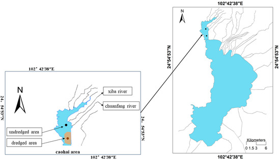 Dianchi is located in Kunming City, Yunnan Province, in southwestern China, at an elevation of 1886 m (Figure 1). Dianchi is the sixth-largest freshwater lake in China and the largest freshwater lake in Yunnan Province, with a water area of 306 km2, an average depth of 4.7 m, and a maximum depth of 9.7 m. The water in Dianchi has a residence time of up to 3.5 years, which promotes the accumulation of nutrients [22]. Based on past investigations of the dredging project in Dianchi Pond, dredged and undredged areas were identified (the dredging site belonged to the area of the second phase of the dredging project in 2005) and, in May 2013, a gravity coring pipe (diameter: 9 cm) device was used to extract the nutrients from the undredged area of the Dianchi Pond Caohai (state-controlled point at Caohai center, 102°38′42.36″ E, 24°58′22.44″ N) and the dredged area (outside the Grass Sea Center, 102°38′42.36″ E, 24°58′22.63″ N). Sediment core samples were collected, sealed in the field, and immediately sent to the laboratory. Sediment cores were cut at 1 cm intervals and 50 cm in length under nitrogen, placed in sterile plastic bags, freeze-dried (at −80 °C for 7 days), ground, and then sieved through a 100-mesh sieve for analysis of N and P content [23].
