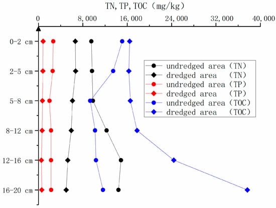 The TOC in the dredged area was relatively stable, fluctuating in the range of 16,300 ± 300 mg/kg, at the depth of 0–12 cm, then increased rapidly to 37,653 mg/kg in the range of 12–20 cm. The TOC content in the undredged area first decreased and then increased with depth, and the inflection point was found in the range of 5–8 cm (9336 mg/kg). The TN and TOC contents were very close (difference of about 5%) at this depth. The TOC content in the dredged area was always higher than that in the undredged area, and the difference between the TOC content at the two points gradually increased with depth.
