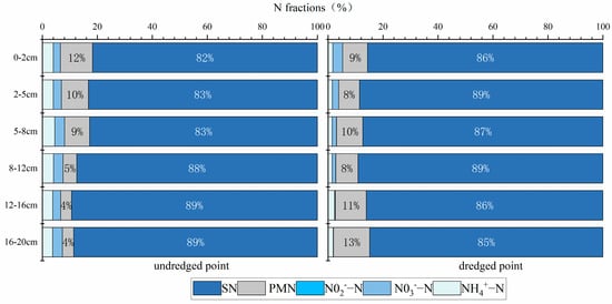 The distribution of nitrogen forms in the sediment cores from the undredged and dredged areas is shown in Figure 3. SN accounted for the majority of the nitrogen forms in the two regions (more than 82%), while the NO2−-N content in the two regions was always very low (close to 0); as such, it is not shown here. The SN in the undredged region increased with depth (mainly divided into two parts: 83% at 0–8 cm and 89% at 8–20 cm), and the proportion of PMON gradually decreased with depth (mainly divided into two parts: 10% at 0–8 cm and 4% at 8–20 cm), and the proportions of NO3−-N and NH4+-N remained stable and low with depth, never exceeding 5%. The proportion of SN in the dredged area as a whole fluctuated with depth, and the change in the proportion was not significant (95–98%). The proportion of PMON increased with depth (83% at 0–8 cm, 89% at 8–20 cm), and the proportion of NO3−-N increased with depth (89% at 0–8 cm). The percentage of SN in the dredged area fluctuated with depth (85–89%), the percentage of PMON increased with depth (fluctuating at 0–12 cm, increasing at 12–20 cm, accounting for about 12%), the percentage of NH4+-N was low and fluctuated with depth, and the percentage of NO3−-N decreased steadily with depth (almost 0% at 16–20 cm). The difference between the two regions is that the NO3−-N and NH4+-N ratios in the undredged region were significantly higher than those in the dredged region, and the PMON ratio in the dredged region was significantly higher than that in the undredged region(at 12–20 cm).