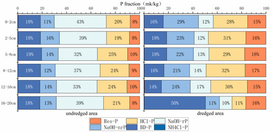 The distribution of phosphorus forms in the column core sediments in the undredged and dredged areas is shown in Figure 4. The percentage of MP fluctuated between 0 and 16 cm, with the percentage of NaOH-nrP in the dredged area being higher than that in the undredged area (21–29% for MP in the dredged area and 11–16% for MP in the undredged area). The percentage of BD-P in the two areas was similar, and the percentage of BD-P in the dredged area rapidly increased to 50% at 16–20 cm. The NH4Cl-P ratio in the two areas was very low (less than 0.3%), so it is not shown here. SP accounted for most of the phosphorus forms in both regions (more than 65% in SP in both regions, except for the dredged region at 16–20 cm, where the percentage of SP was smaller). The percentage of NaOH-rP was higher in the undredged region than in the dredged region (33–43% in the undredged region and 10–17% in the dredged region), while the percentage of HCl-P was similar in both regions (except for the 16–20 cm dredged area, which was lower at 11%). The percentage of Res-P was slightly higher in the dredged area than in the undredged area (8–10% Res-P in the undredged area and 15–18% Res-P in the dredged area).