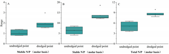 Box line plots of nitrogen:phosphorus ratios in the dredged and undredged areas are shown in Figure 5. The mobile nitrogen:phosphorus ratio in the dredged area was higher than that in the undredged area overall (minimum in the dredged area > maximum in the undredged area), the anomalies in the dredged area were higher (up to 2.98 at 12–16 cm), the median value in the undredged area was 0.98, the median value in the dredged area was 1.86, and the range of the IQR in the undredged area was slightly larger than that in the dredged area. The stabilized nitrogen:phosphorus ratio was overall higher in the dredged area than in the undredged area (minimum value of 12.16 in the dredged area and maximum value of 8.60 in the undredged area), the anomalies were higher in the dredged area (up to 18.56 at 16–20 cm), the median value was 6.45 in the undredged area and 12.61 in the dredged area, and the range of the IQR in the undredged area was larger than that in the dredged area. The TN and TP ratios were overall higher in the dredged area than in the undredged area (minimum value of 7.85 in the dredged area and maximum value of 8.86 in the undredged area), whereas the anomalies in the undredged area were close to their median values. The median value was 5.16 in the undredged area and 8.42 in the dredged area, and the range of the IQR was larger in the undredged area than in the dredged area.