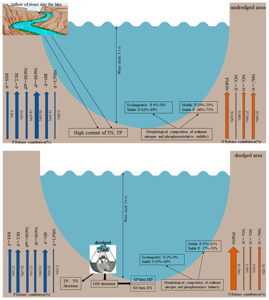 According to the data in Figure 4, it can be clearly seen that dredging had a greater impact on the phosphorus storage pattern. This was also true in the study of Liu, C. et al. [38], who found that the control of phosphorus release after dredging was better than that of nitrogen, while the control of nitrogen was maintained longer than that of phosphorus under the influence of external pollution loads. In contrast, both the nitrogen form percentage and the phosphorus form percentage at the undredged sites remained relatively stable with depth changes. It can be seen that dredging disrupts the internal equilibrium that has been established in the lake system over many years, which may be very difficult to re-establish. In addition, disruption of the sediment–water interface has a direct and severe impact on nutrient cycling in the lake system, which may have a dramatic effect on the system. The specific mechanisms of N and P retention are shown in Figure 6.