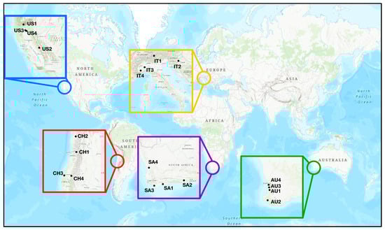 Extreme, unpredictable climate events can have adverse impacts on water security, society, and natural ecological systems. Extreme events are predicted to change in certain climate change hotspots of the world, including California in the United States [,]. Of interest in the present study is how Mediterranean regions will change, as they are characterized by having mild winters with variable precipitation periods, and hot, dry summers [,]. This climate region exists at equal distances from the equator, ranging between 30° North or South and 45° North or South. Furthermore, Mediterranean climate zones fall on the continent’s western side. The five Mediterranean regions around the world are in California, the Mediterranean Basin in Europe, Western Australia, Chile, and the Cape of South Africa []. Furthermore, these regions are identified in the Koppen–Geiger Climate Classification world map [], have cool, damp winters and hot dry summers, and are highly desirable due to their ideal weather conditions. These regions host agricultural hotspots, dense populations, and diverse species, making it important to understand their climate patterns.