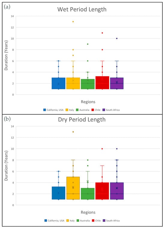 Boxplot of the duration in years of (a) wet period length and (b) dry period length averaged by region. The X in the boxplot represents the mean.