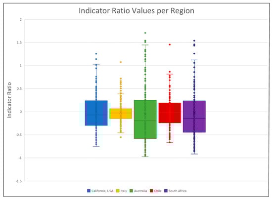 The rapid change from dry to wet or wet to dry states (whiplash) is evaluated in Figure 3 and Table 3. Figure 3 provides a compilation of all the indicator values expressed as an indicator ratio described in Section 2.2. A positive indicator ratio is a rapid transition from dry to wet state, and a negative indicator ratio is a rapid transition from wet to dry state. There are higher whiplash events from dry to wet, as shown by the larger positive values in Figure 3. Comparing this result to Figure 2, it is concluded that there are shorter intense wet periods and longer and less intense dry periods. Variability is highest in the United States (California), Australia, and South Africa. Results from Table 3 display that most countries have similar ratio values, with exceptions for the United States (California) and Chile.
