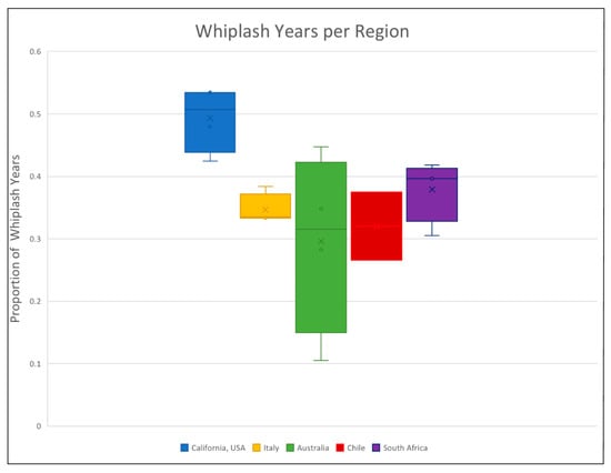 Figure 4 presents the proportion of whiplash years that occur in each country for all stations. The US (California) locations have the highest proportion of years that are whiplash years—between 42 and 53% of years. Australia has the largest variability, from 10 to 45%. Italy, Chile, and South Africa are similar, and have about 35% of their years as whiplash years.