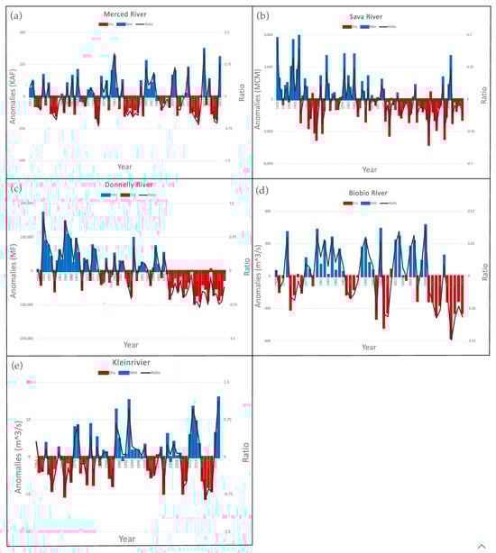 Time series of anomaly (blue and red) and ratio (black) values. Blue areas represent surplus periods and red areas represent deficit periods. One station’s plot that is representative of all four stations in the area is chosen per region: (a) Merced River in California, USA (US2); (b) Sava River in Slovenia (IT2); (c) Donnelly River in Australia (AU2); (d) Biobio River in Chile (CH3); (e) Kleinrivier in South Africa (SA3).