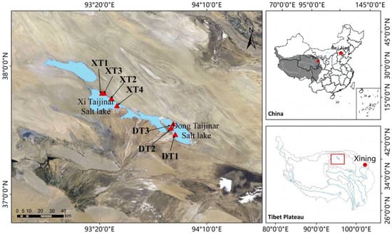 Hypersaline salt lakes and marshes arise in arid or semi-arid regions when evaporation surpasses precipitation, leading to a continuous concentration of salts [1,2]. The Qaidam Basin, on the northeastern Qinghai–Tibet Plateau, is China’s largest continuous salt marsh [3]. Within this basin, the Dong Taijinar (DT) and Xi Taijinar (XT) Salt Lakes are two prominent salt lakes that share similar geographical and climatic conditions (Figure 1). Both lakes sit at approximately 2628 m above sea level and span an area of around 100 km2 [4,5]. DT is known for being a significant lithium salt production area, and along with XT and Qarhan Salt Lake, it provides a substantial portion of the lithium resources for China and the global market [6,7]. The abundance of boron, potassium, and lithium in DT and XT is largely attributed to the consistent inflow from the Nalenggler catchment [3,8].