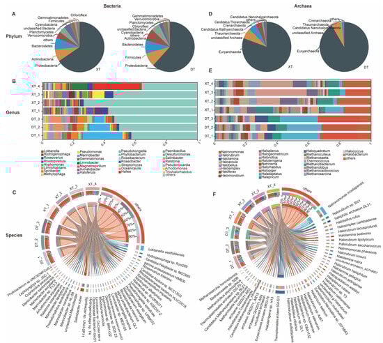 Taxonomic analysis of the DT and XT samples at the phylum, genus, and species levels of bacteria and archaea. (A) Pie chart of the distribution of bacteria at the phylum level in the DT and XT samples. (B) Histogram of the distribution of bacteria at the genus level in DT and XT samples. (C) Circus plot of the distribution of bacteria at the species level in the DT and XT samples. (D) Pie chart of the distribution of archaea in DT and XT samples at the genus level. (E) Histogram of the distribution of archaea in DT and XT samples at the genus level. (F) Circus plot of the distribution of archaea in DT and XT samples at the genus level.