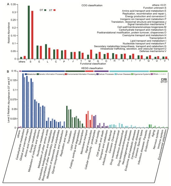 COG and KEGG function annotation of the DT and XT communities. (A) The x-axis represents the functions in the COG classification, the y-axis represents the proportion of each function in the sample, and different colors represent the two lakes. (B) The x-axis indicates the KEGG metabolic pathways at classification level 2; the y-axis indicates the corresponding percentages of the samples, and different colors show the clustering results.