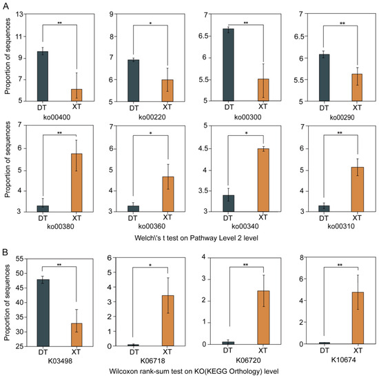 (A) Eight pathways with the most significant differences at level 2 of KEGG; (B) KEGG orthology with significant differences in the ko00260 pathway; 0.01 < p ≤ 0.05 * and 0.001 < p ≤ 0.01 **. Phenylalanine, tyrosine, tryptophan biosynthesis (ko00400). Arginine biosynthesis (ko00220). Lysine biosynthesis (ko00300). Valine, leucine, and isoleucine biosynthesis (ko00290). Tryptophan metabolism (ko00380). Phenylalanine metabolism (ko00360). Histidine metabolism (ko00340). Lysine Degradation (ko00310). trk/ktr type potassium uptake protein (K03498). L-2,4-diaminobutyric acid acetyltransferase (K06718). L-ectoine synthetase (K06720). Ectoine hydroxylase (K10674).