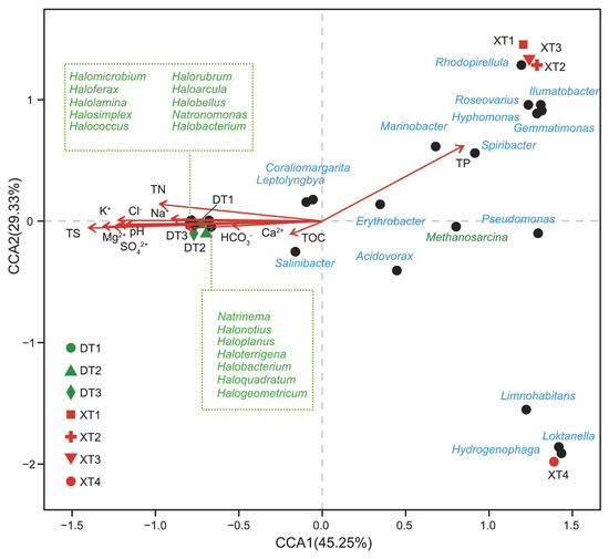 CCA of the relationship among dominant genera and physicochemical variables in the two salt lakes. The sample coordinate table shows the relative positions of samples in each dimension after dimension reduction. Environmental factors are represented by arrows in red, and the length of the arrow line represents the magnitude of the correlation. The longer the line, the greater the correlation, and vice versa. The black dots in the figure represent the genus of bacteria and archaea with names in different colors. Green represents archaea and blue represents bacteria. Different colors and shapes represent different subgroups.
