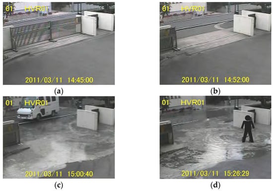 Intensified water spout during aftershock. The pictures were captured using a fixed-point camera provided by Irifune Junior High School: (a) before the main shock; (b) immediately after the main shock; (c) 10 min after the main shock; and (d) 10 min after the aftershock [5]. Note that main shock and aftershock occurred at 14:46 and 15:15, respectively.
