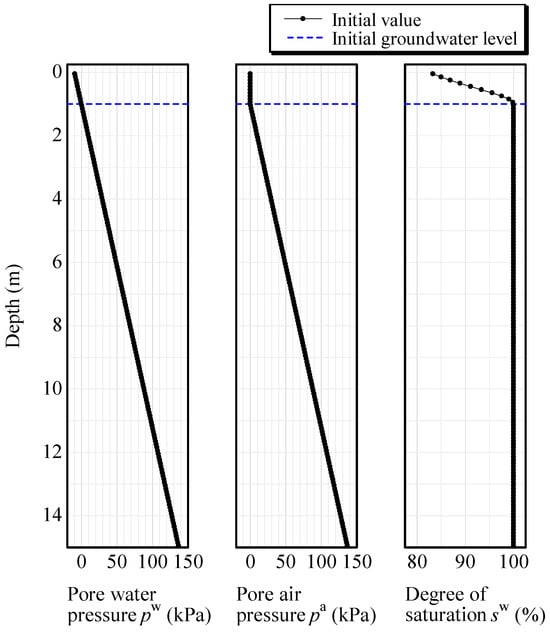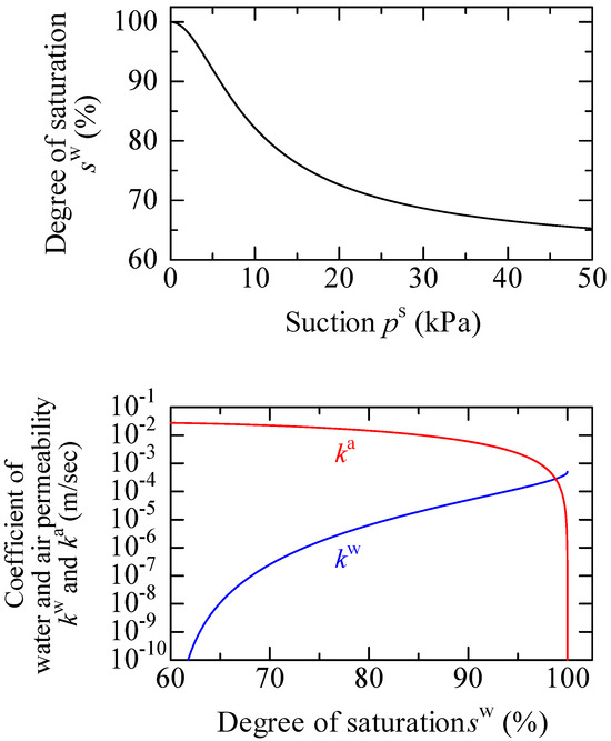 Table 1 shows the material constants and initial values for the elastoplastic constitutive equation SYS Cam-clay model [12]. The values were determined from the numerical simulations of mechanical tests of soils sampled from Urayasu City ground after the earthquake [20], and the initial values for specific volume, degree of structure, stress ratio, and degree of anisotropy were given to each layer uniformly while the initial overconsolidation ratio was distributed in the vertical direction according to the overburden pressure. The skeleton stress equation [24] was used in the elastoplastic constitutive model. Table 2 shows the material constants for the soil–water characteristics of the van Genuchten [25] and Mualem [26] model, and other physical properties. Both saturated and unsaturated states were considered for the sand layer, while saturated states were assumed for the clay and bedrock layer. Figure 3 shows the soil–water characteristic curve and the relations between water/air permeability and the degree of saturation for the sand layer. The saturated coefficient of water permeability for the sand layer was determined from a permeability test using sand sampled in Urayasu City [19]. The dry coefficient of air permeability for the sand layer is calculated from the saturated coefficient of water permeability by using the ratio of the viscosity coefficients of air and water [27]. The other material constants related to the soil–water characteristic of the sand layer were determined by referring to a past study on experimental results of clayey sand [28] because the buried soil layer and alluvial sand layer in Urayasu City ground contained a large amount of fine grains [5] and we were unable to obtain the result of a soil water retention test using Urayasu sand. The other values were taken from Nakai et al. [20]. The initial pore water pressure was set equal to the pore air pressure at the groundwater level, assuming the hydrostatic pressure distribution in the vertical direction. The initial was assumed to be zero at the initial ground surface height and was distributed vertically by considering the self-weight of air above the groundwater level [13]. The initial below the groundwater level was equal to because the suction was zero. The initial degree of saturation was calculated from the soil water characteristic curve according to the suction value. Figure 4 shows the initial vertical distributions of , , and in the sand layer.