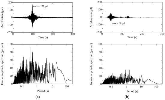 Figure 5 shows input seismic waves for the main shock and the aftershock and their Fourier amplitude spectrums. We used the east–west components of the seismic waveforms recorded at KiK-NET Shimousa (CHBH04, measurement depth 2300 m, Vs = 2540 m/s [29]), where both the main shock and aftershock waveforms of the 2011 Tohoku earthquake were available. Because the seismic velocity structure of the ground at KiK-NET Shimousa was not available, the following Midorikawa’s Equation [30], which empirically gives the maximum velocity amplitude ratio Av between the ground surface and the seismic bedrock (Vs = 3000 m/s), was used: