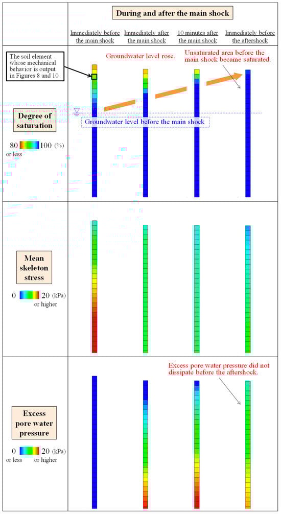 First, we discuss the results during and after the main shock, as shown in Figure 6. The distribution of demonstrates that the groundwater level was rising after the main shock. During the main shock, MSS decreased in the saturated soil elements, whereas MSS hardly decreased in the soil elements with a low degree of saturation near the ground surface. During the main shock, the increase in EPWP is attributed to negative dilatancy (i.e., plastic volume compression) due to seismic cyclic shear. In this analysis, EPWP in the sand layer started dissipating around the end of the main shock. In association with the dissipation of EPWP, the groundwater level rose due to the consolidation drainage of the sand layer below the groundwater level after the main shock and near the ground surface increased. This saturation led to a decrease in MSS near the ground surface. Although the EPWP started to dissipate in the deeper saturated area of the sand layer, the EPWP did not dissipate immediately before the aftershock, and the MSS was lower immediately before the aftershock than before the main shock.