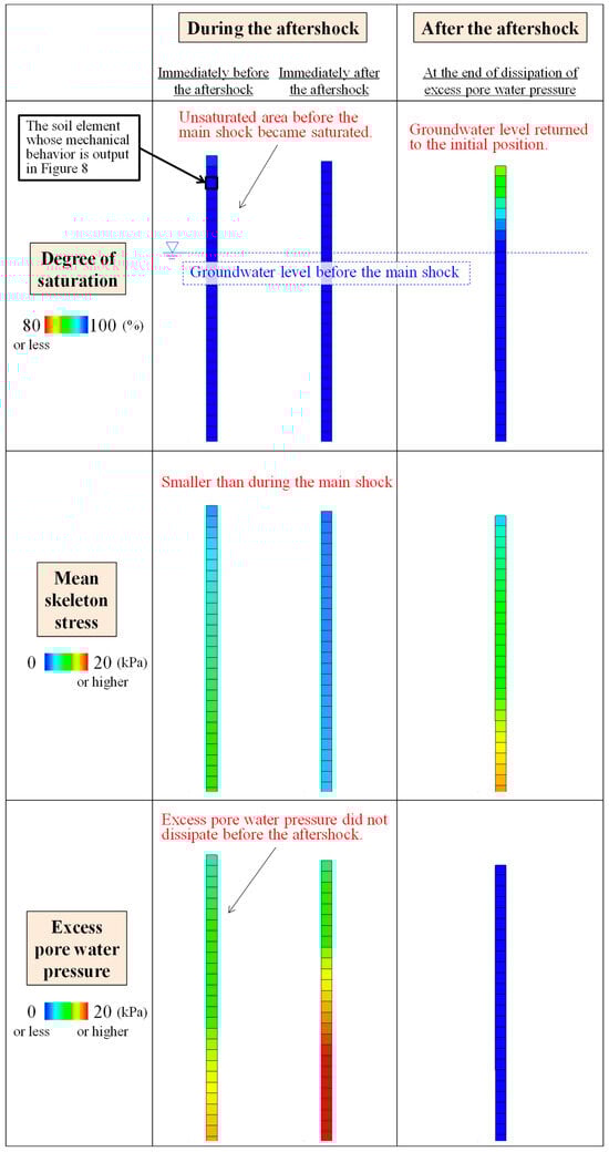 Distributions of degree of saturation, mean skeleton stress, and excess pore water pressure during and after the aftershock, which occurred after the excess pore water pressure due to the main shock being fully dissipated.