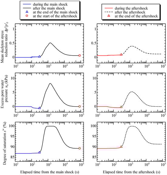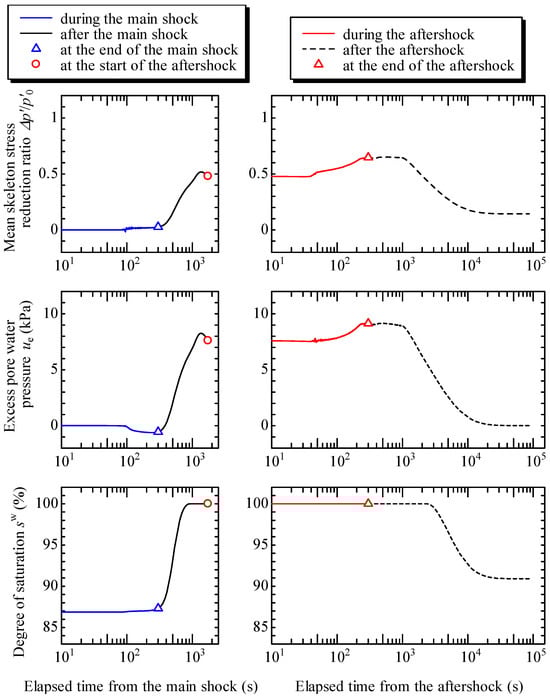Temporal change in mean skeleton stress reduction ratio, excess pore water pressure, and the degree of saturation of the soil element in the unsaturated state before the main shock, as shown in Figure 6 and Figure 9, when the aftershock occurred after the excess pore water pressure due to the main shock being fully dissipated.