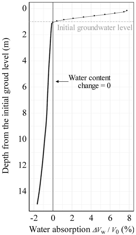 Here, the mechanism of groundwater level rise caused by the earthquake is described in more detail. Figure 11 shows the distribution of the amount of water absorption immediately before the aftershock. As described above, it is evident that consolidation drainage of the sand layer below the groundwater level caused the water absorption of the sand layer above the groundwater level. Figure 12 is a conceptual diagram illustrating the mechanism of groundwater level rise caused by the earthquake. First, considering a one-dimensional consolidation under the upper-end-drained and lower-end-undrained conditions for the saturated ground, shown in Figure 12a, the amount of ground settlement is equal to the amount of drainage from the ground. Therefore, the supernatant water level produced by consolidation drainage is equal to the height of ground surface before consolidation without the consideration of evaporation, rainfall, etc. In the present analysis, the seismic cyclic shear causes a negative dilatancy in the initially saturated ground below the groundwater level, resulting in positive EPWP and consolidation settlement accompanied by the dissipation of EPWP. However, in the presence of an unsaturated soil layer above the groundwater level, as shown in Figure 12b, water drained by consolidation is supplied to the unsaturated soil layer. Here, since the unsaturated soil is composed of soil particles, pore water, and pore air, the groundwater level rises by the volume of the soil (i.e., soil particles + pore water + trapped pore air) sunk in the portion corresponding to the supernatant water. For example, if the amount of consolidation drainage from the saturated ground is the same, the smaller the volume of pore air in the unsaturated soil layer, i.e., the smaller the void ratio of the unsaturated soil layer under the same degree of saturation, the higher the groundwater level rises. This is the mechanism of seismic-induced groundwater level rise described in this analysis. Therefore, in order to investigate the rise in groundwater levels, it is necessary to precisely calculate the settlement of ground and the amount of water drainage/absorption within the framework of three-phase finite deformation analysis. To better understand the mechanism of groundwater level rise, case studies were conducted in the next section, Section 4.