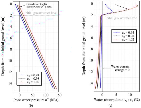 Case analyses were conducted by varying the initial void ratio of the entire sand layer. Specifically, based on the case where the initial void ratio e0 was 0.98, the same as in Section 3, computations were performed for the cases where the void ratio was reduced to e0 = 0.94 (denser sand layer) and increased to e0 = 1.02 (looser sand layer). Figure 13 shows the distributions of the degree of saturation, pore water pressure, and the amount of water absorption ΔVw/V0 (V0: volume of the soil before the earthquake; ΔVw: volume of water absorption) when the excess pore pressure in the sand layer completely dissipated. Note that the groundwater level is located where the pore water pressure is zero in the distributions of pore water pressure. First, the results, when pore water did not exchange with the outside of the sand layer, show that the groundwater level rose due to the exchange of pore water in the sand layer. Next, comparing the results when the initial void ratio was changed, i.e., e0 = 0.94 and 1.02, the distributions of the degree of saturation and pore water pressure show that the groundwater level rose higher as the void ratio increased, in contrast to the above explanation. The distributions of the amount of water absorption show that the larger the void ratio, the larger the amount of drainage from the saturated sand layer, i.e., the groundwater level rose higher as the void ratio increased because the loose ground with a larger void ratio exhibited larger plastic volume compression, which led to a larger amount of consolidation drainage from the saturated sand layer. In addition, the analysis result in this section reached a steady state without a return of the groundwater level because the undrained condition was set at the ground surface as well as the other boundaries, while the groundwater level rose temporally and returned to the initial groundwater level due to the total head constant condition set at the ground surface in the analysis of Section 3.