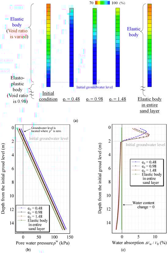 Distributions of degree of saturation, pore water pressure, and the amount of water absorption when the void ratio of the unsaturated sand layer modeled as an elastic body varies: (a) degree of saturation; (b) pore water pressure; and (c) amount of water absorption.