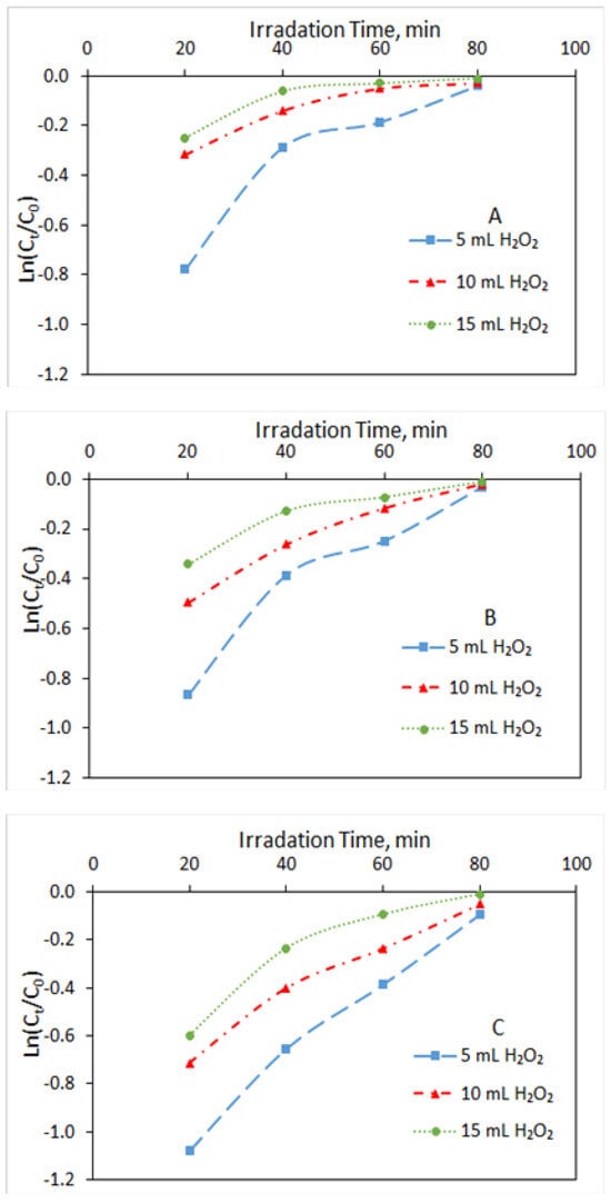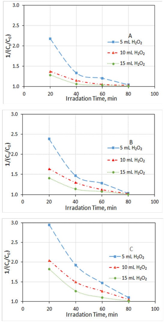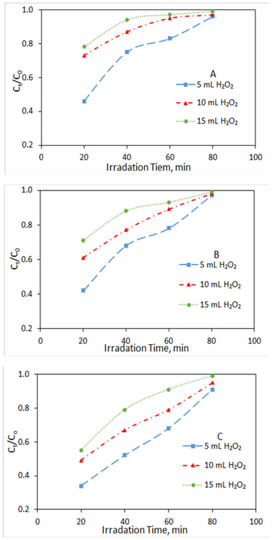 3.1. Effect of the Amount/Concentration of H2O2 in the Reacting Solution