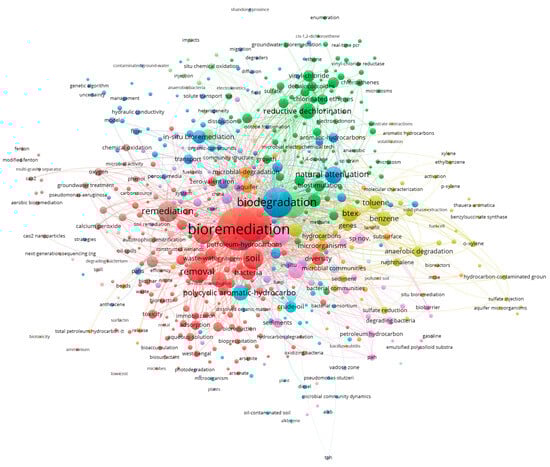 There is a variety of methods for in situ remediation of groundwater, such as air injection, in situ bioremediation (ISB) technology, multiphase extraction technology, in situ chemical remediation (ISCR) technology, and phytoremediation technology. Compared with other in situ remediation methods, enhanced in situ bioremediation technology can reduce problems such as incomplete remediation, concentration tailing or rebound, secondary pollution, and relatively high costs [7,8,9]. Indigenous microorganisms or specific degradation bacteria were used in enhanced in situ bioremediation to modify local biological culture. Adding various types of enhanced bioremediation agents with carbon, electron donor, or acceptor-releasing material can provide a suitable environment and nutrients for microbial degradation, accelerating microbial reproduction rate and improving pollutant removal efficiency [10,11,12,13]. Through the keyword co-occurrence visual analysis of the literature on the global groundwater bioremediation survey and research from 2010 to the present (Figure 1), it is found that the in situ bioremediation of groundwater for organic pollution is mainly composed of halogenated hydrocarbon, petroleum hydrocarbons, and polycyclic aromatic hydrocarbons. The main research direction is the microorganism community, degradation of pollutants, and various agents used to enhance the bioremediation process.
