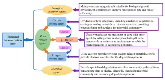 Groundwater-enhanced bioremediation agents can improve the ability to remove pollutants by increasing the density and activity of microorganisms. Based on their different mechanics, they were classified into three categories: microbial nutrition agents, slow-release agents, and microbial agents [14]. The categories and main objectives of the bioremediation agents are shown in Figure 2. Biological nutrition agents could accelerate microbial reproduction by providing nutrients and stimulating factors necessary for microbial reproduction to control pollutants. Slow-release agents are able to continuously provide surfactants, carbon sources, and electron acceptors through their slow-release process, achieving the function of long-lasting and stable purification of polluted areas. Microbial agents provide specific microorganisms to accelerate microbial enrichment and achieve the effect of degrading pollutants. The main components of the three categories differ from each other, and their key formulas and test results of the agents are various.