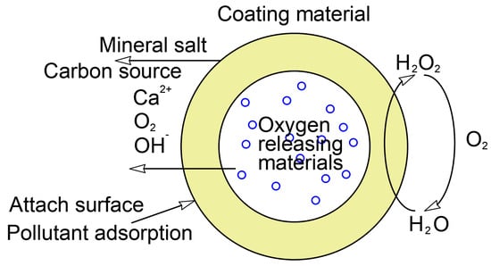 At present, the methods that can effectively prolong the release period include using coating materials (Figure 3) or the preparation of nano oxygen-releasing materials. Coating materials are usually based on easily biodegradable sodium alginate [25,26,43,45,54,55,56]. Sodium alginate, as an environmentally friendly and cost-efficient slow-release material, has a good release ability, is biodegradable, and can provide a better contact surface for indigenous microorganisms. Other slow-release materials, such as paraffin, cement, etc., also have the effect of increasing the slow-release ability and are always combined with KMnO4 and Na2S2O8 [57], used as oxygen-releasing materials. Coating materials tend to form larger particles and are always applied in the permeable reactive barrier. The in situ reaction zone needs good migration performance, which has led to the development of nano-agents. By synthesizing nano-CaO2, nano-MgO2, or making composite oxygen-releasing materials, the oxygen release period can be extended to more than 6 months.
