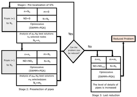 In the second stage, the number of pipes is reduced. Nit simulations were performed with n = ns nodes in the network. The configuration at this stage is as follows: ND = ND0 candidate diameters and N = N0 divisions in the base area of the ST. The solutions obtained after the N simulations are ranked according to the result of the objective function. A percentage Pm is applied to the Nit simulations to select only some of the best solutions. The best solutions are analyzed, and ms pipes and ns nodes are selected to form the new reduced problem. The first and second stages are repeated until the size of the problem cannot be further reduced. More details about the specific stages 1 and 2 can be found in reference [18].