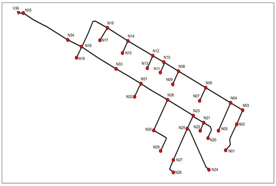 The E-Chicó drainage network [18] is part of the drainage network of the city of Bogota. The network is depicted in Figure 3 and comprises 35 watersheds that cover a total of 51 hectares. The network has 35 circular pipes with diameters that vary between 0.3 m and 1.4 m. The total length of the network is 5 km. The difference in height between the highest point and the lowest point of the network is 39.28 m. The network is entirely gravity-fed.