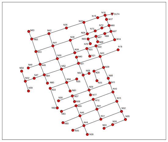 On the other hand, the Ayurá district serves as a catchment area within the drainage network of Medellin in Colombia. The Ayurá network’s outfall is linked to the Medellin River, which courses through the city from south to north. A total of 83 hydrological subcatchments with 73 nodes and 86 circular conduits ranging from 200 mm to 1050 mm in diameter were identified, and the network spanned 22.5 hectares. The elevation drop from the highest to the lowest point in the network is 15.61 m. The terrain profile is conducive to rainwater drainage, with an entirely gravity-fed network. Ayurá was chosen for this study due to the corresponding mesh network structure and the significant number of decision variables. Figure 4 provides an illustration of the Ayurá network.