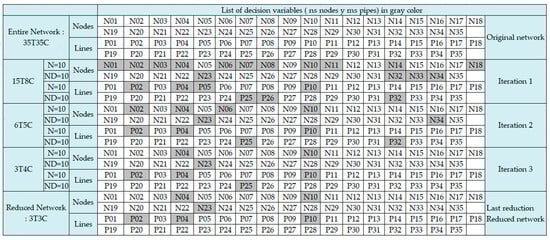 - Through successive iterations, the number of decision variables for the E-Chicó network decreased from 70 to 7, and that for the Ayurá network decreased from 159 to 38, representing reductions of 90% and 76.1%, respectively. These reductions critically contribute to the efficiency of the optimization algorithm, as evidenced by the substantial decrease in problem size from 2.3·10100 to 1·1031 for E-Chicó and from 7.8·10122 to 1·1073 for Ayurá.