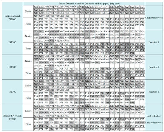 In the case of the E-Chicó network, the number of decision variables was reduced from 70 to 7, with the preselected nodes for ST placement and the preselected pipes for potential changes in pipe diameter identified. For the Ayurá network, the original problem was reduced from 159 decision variables to 38. These outcomes signify noteworthy reductions in decision variables of 90% and 76.1%, respectively.