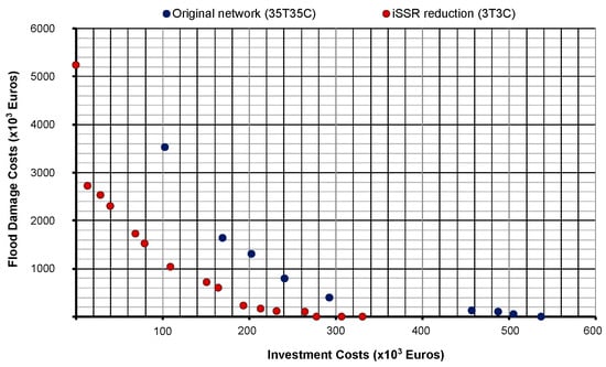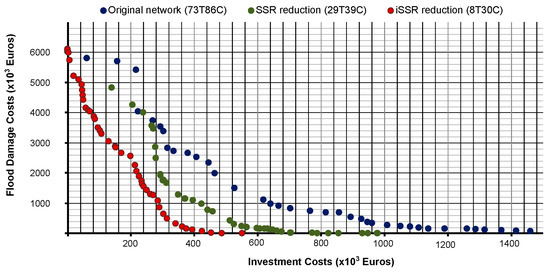 The approach involves an unlimited budget, resulting in solutions for zero-flooding scenarios. Once again, the reduced networks obtained with SSR and iSSR demonstrate superior performance, with the Pareto front positioned to the left of the full-network Pareto front. Specifically, the solution for zero flooding requires an investment of €2,269,492 for the original network (73T86C), an investment of €1,183,541 for the reduced network obtained with SSR (29T39C), and an investment of €552,611 for the reduced network obtained with iSSR (8T30C). This finding further underscores the advantage of reducing the problem size to achieve better results.