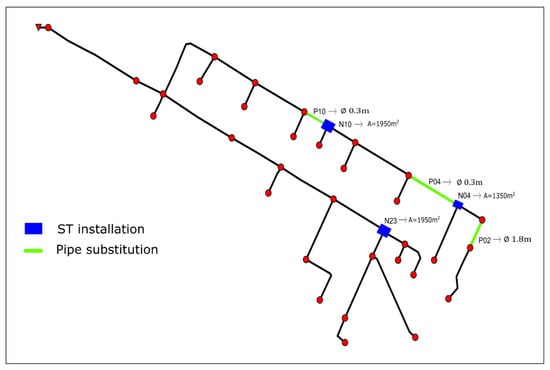Figure 10 provides an overview of the ST installation locations and the pipes to be substituted in the Ayurá network. Table 9 details the list of pipes to be replaced, along with their corresponding diameters. Furthermore, Table 10 specifies the nodes at which storm tanks should be installed, along with their corresponding base areas, contributing to the comprehensive solution for achieving zero flooding in the reduced network (8T30C).