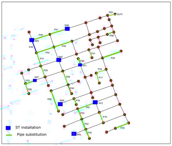 Specifically, Figure 5 and Figure 6 depict the nodes chosen for prelocated STs and the pipes selected for potential replacement during the iSSR process for the E-Chicó and Ayurá networks, respectively.