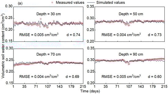 Measured and simulated volumetric soil water content (VSWC) at different depths (0, 30, 50, and 70 cm) during the (a) calibration and (b) validation periods.