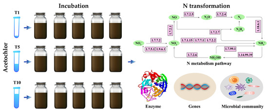 Before incubation, the riparian soil was stored in the dark at 4 °C for one day. The standard solution of ACE was purchased from Guangdong Wengjiang Chemical Reagent Co., Ltd., Guangzhou, China. Three concentrations (0.5, 2.5, and 5 mg kg−1) were applied to observe changes in the N-cycling microbial communities in riparian soils (Figure 1). Specifically, 0.5 mg kg−1 (T1) represents the recommended field dose of ACE, while 2.5 and 5 mg kg−1 (T5 and T10) represent the potential cumulative concentrations due to overapplication of ACE in some agricultural production activities. Riparian zones are hotspots suffering from agricultural nonpoint-source pollution [26], so they are often exposed to long-term added pesticides. Soil samples without ACE were used as controls.