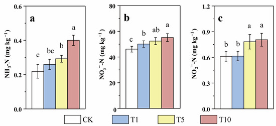 Response of soil NH3-N (a), NO3−-N (b), and NO2−-N (c) contents to three levels of ACE treatment during incubation (Different lower case letters above columns indicate significant differences at p < 0.05).