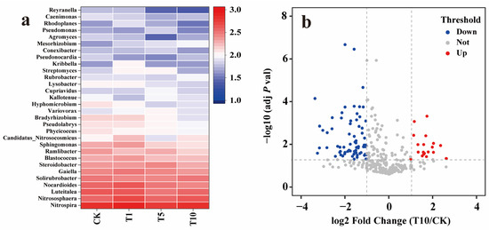 Analysis of the N-cycling microbial community at the genus level in response to ACE. (a) The top 30 abundant genera associated with the N cycle in response to ACE. (b) Volcano plot of the differentially expressed genera in comparing the T10 and CK groups. The blue point and the red point represent the significantly downregulated and the significantly upregulated genera (p-value < 0.05 and |log2 (fold-change| > 1), respectively.
