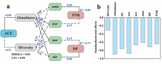 SEM is a statistical methodology that analyzes the relationships between variables based on their covariance matrix. The SEM framework for modeling the impact of ACE on the microbial N transformation process is presented in Figure 7a. The model’s validation findings, including RMSEA and CFI, suggested that the measurement model was valid and reliable. ACE exerted significant negative feedback effects (total effect = −0.90) on the N-cycling microbial community abundance while exerting no significant effect (total effect = −0.31) on the Shannon diversity index. These results were consistent with the above sequencing results, which showed that ACE inhibited the growth and reproduction of the N-cycling microbial community. Afterwards, the N-cycling microbial community abundance significantly positively affected nxr and nir activity, whereas the Shannon diversity index showed no significant effects on the activities of all four enzymes, which is indicative of a direct correlation between enzymatic activity and N microbial abundance but not with diversity. Finally, amo activity showed a significant effect (total effect = 0.69) on the PNR, and nir showed a significant effect (total effect = 0.98) on the DP, which indicates that, under ACE inhibition, the amo enzyme drove more changes in PNR than the nxr enzyme and the nir enzyme was more indicative of changes in DP than the nor enzyme.
